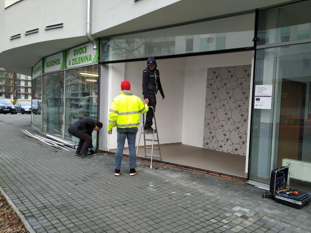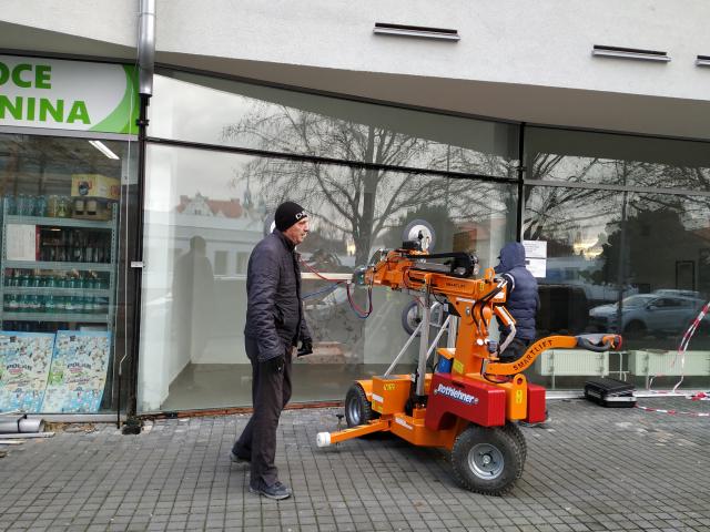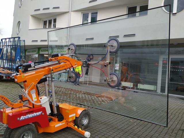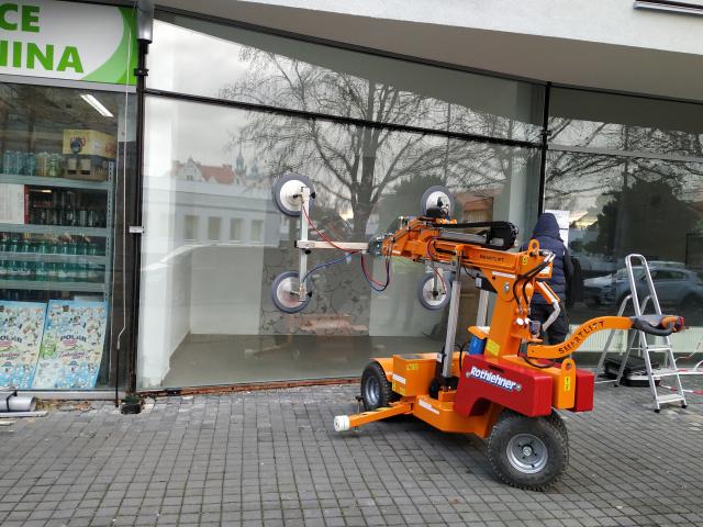 Relizace zasklení výlohy manipulátorem SL608 na ulici v Nymburce.